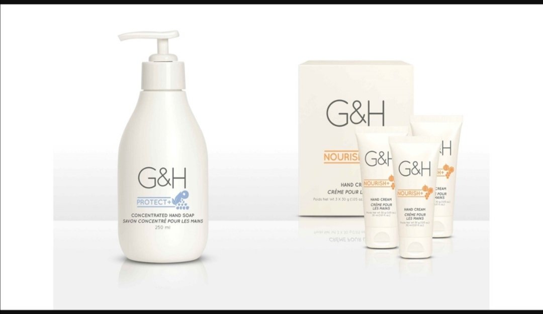 Un envase de Jabón Concentrado para Manos G&H Protect Plus y una colección de cuatro diferentes envases de Crema para Manos G&H Nourish Plus, ambos de Amway.